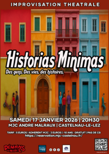Historias Minimas Les Démons du M.I.D.I vous proposent des destins croisés improvisés inspirés par le public... Des tranches de vie, des instants drôles, émouvants et bien plus encore ! Votre esprit fera le lien entre tous ces duos sans même lui demander Ce spectacle d'improvisation est adapté du film argentin éponyme de Carlos Sorin. PAF: 5€ / 3€ adhérent MJCRéservation sur : https://reservation.mjc-castelnau.fr/Paiement sur place espèce ou chèque PAS DE CB