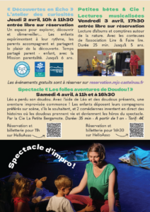 - Lectures musicalisées jusqu’à 5 ans – Vendredi 3 Avril, à 17h30 – « Petites bêtes & Cie ! » | Réservation sur : reservation.mjc-castelnau.fr