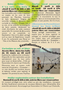 - Découverte et exploration jusqu’à 5 ans – Jeudi 9 Avril : de 10h à 11h00 – Bébé en tribu « La voix des Bois » | Réservation sur : reservation.mjc-castelnau.fr