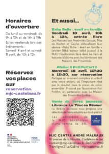 - Temps partagé parent – enfant – Jeudi 16 Avril : De 10h à 11h30 – « Moments de Parenthèse » | Réservation sur : reservation.mjc-castelnau.fr